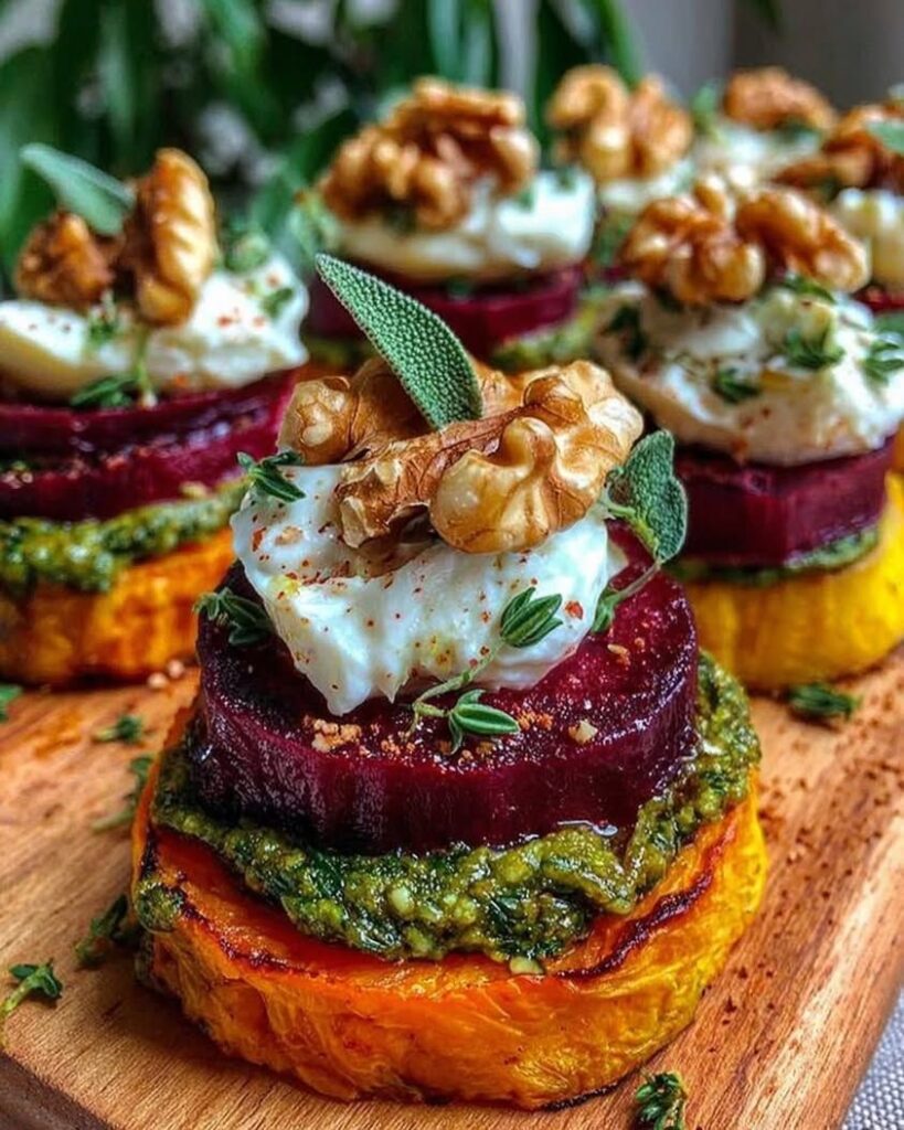 Sweet Potato & Beet Stacks with Pesto and Burrata
