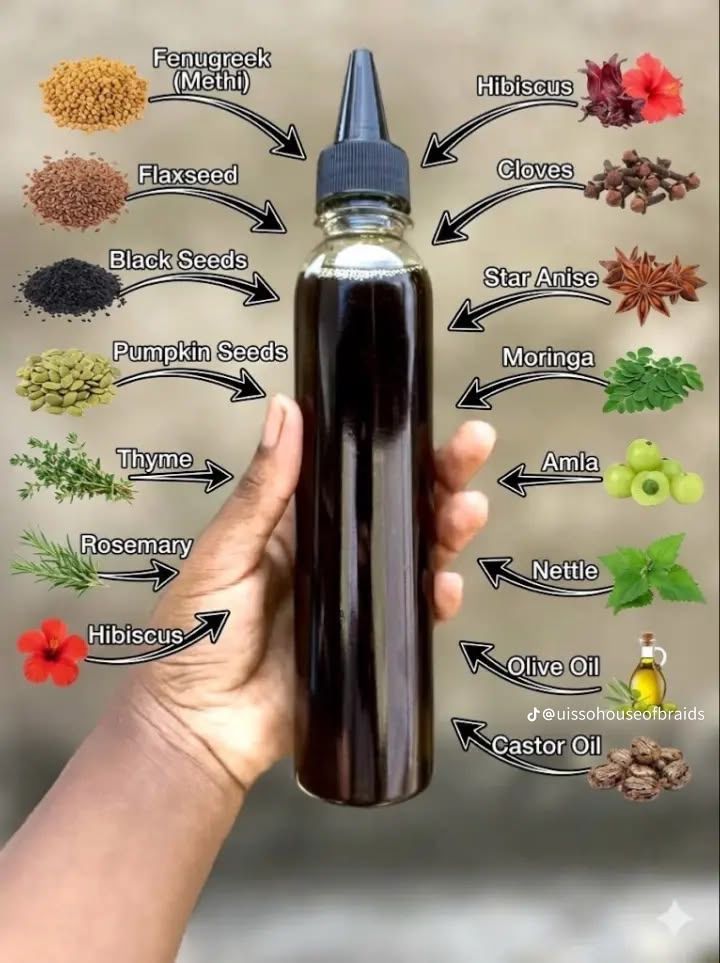 This image showcases a powerful homemade herbal oil blend made from a combination of natural seeds, herbs, and nourishing oils. Each ingredient plays a unique role in improving hair health, strengthening roots, and promoting growth.
