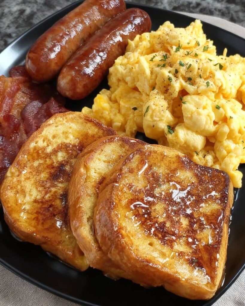 Nothing beats a classic comfort breakfast. This hearty plate of fluffy eggs, crispy bacon, savory sausages, and warm toast is the kind of breakfast that instantly lifts your mood and keeps you satisfied for hours. It’s simple, rich, and packed with protein, making it perfect for a relaxed weekend morning or a special family breakfast.