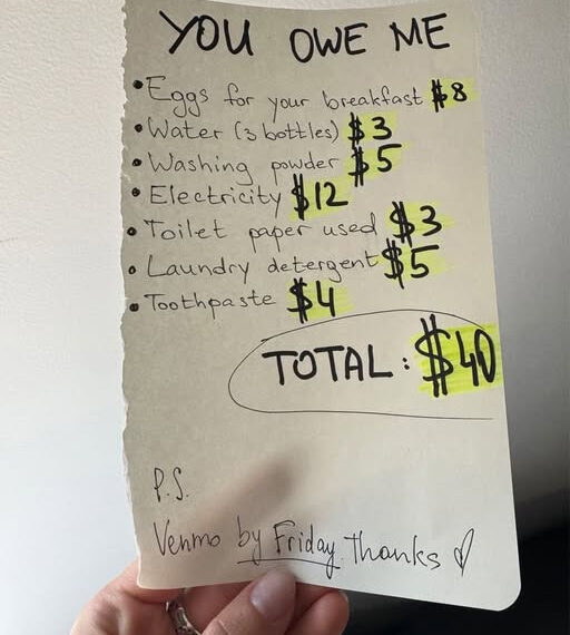 Then Monday morning came. On the counter sat a folded note with my name written in pink ink. I smiled, expecting a thank-you. Instead, it was an invoice: eggs $8, water $3, electricity $12—totaling $40, followed by “Please Venmo by Friday.” I laughed, then fumed. She’d actually billed me for staying in her messy house and caring for her child.